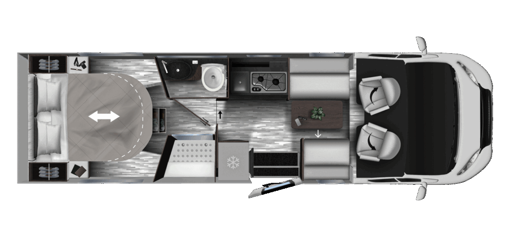 KEA Kompakt 68 tilbyr et interiør preget av rene linjer, vertikale detaljer og en moderne stil som balanserer både funksjon og design. Bruken av harmoniske farger og raffinerte materialer skaper et rom som føles eksklusivt og behagelig. Her handler alt om detaljer som løfter bobilopplevelsen til et nytt nivå.