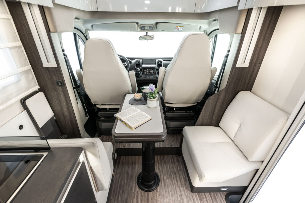 Med store vinduer, flere takvinduer og et panoramisk tak fylles bobilen med naturlig lys, som gir en lys og åpen atmosfære. Dette fremhever den moderne estetikken og sikrer høy bo-komfort.