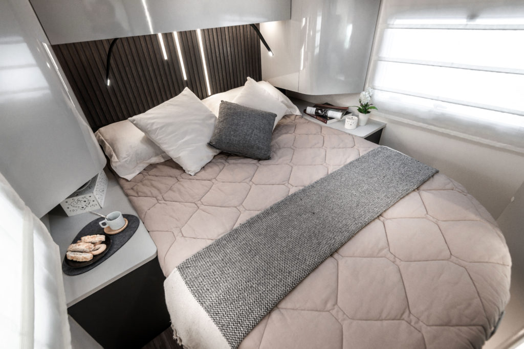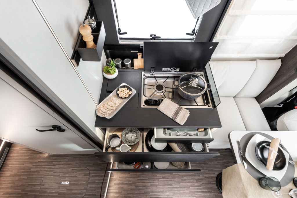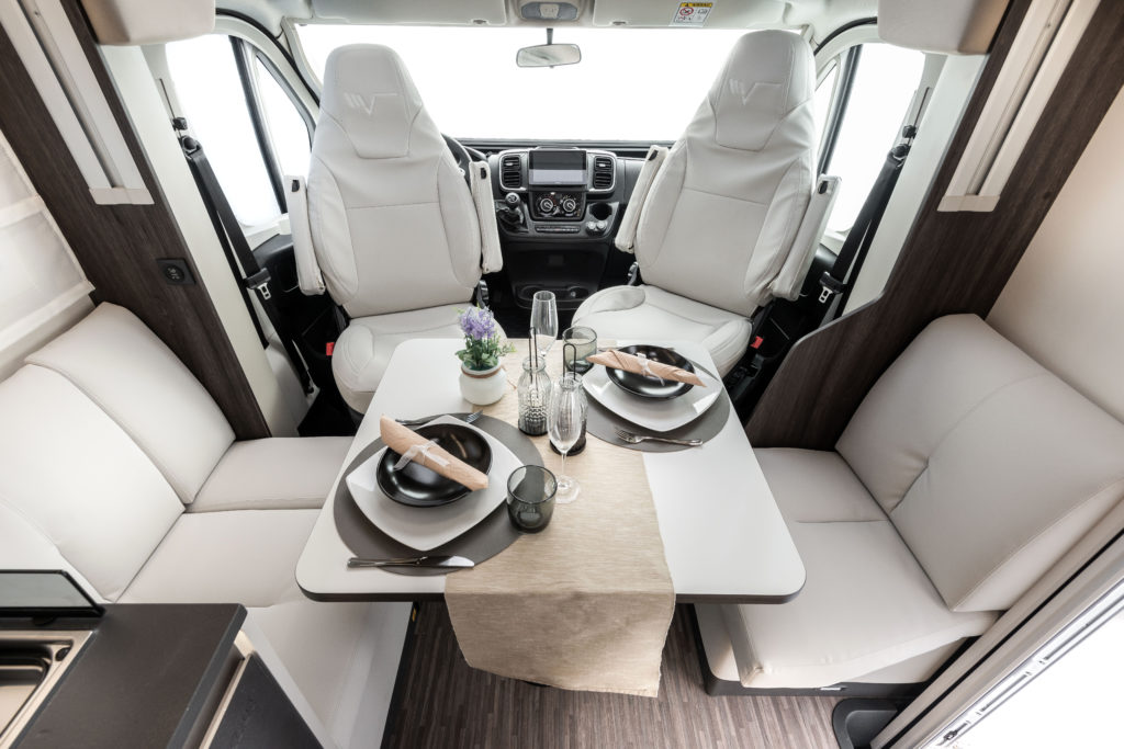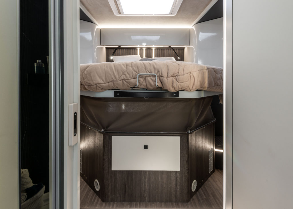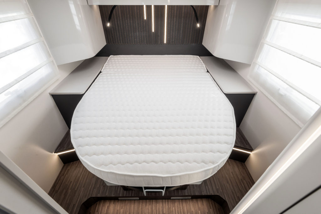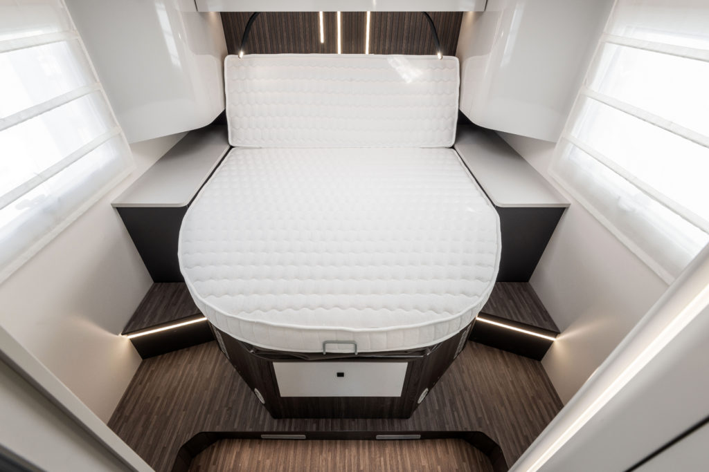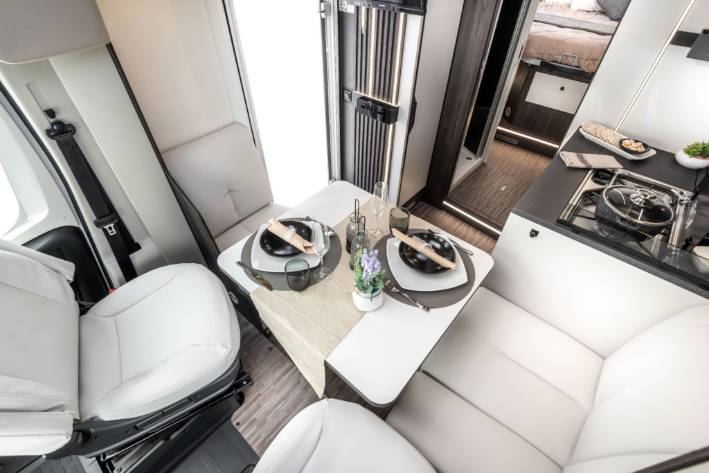 Med store vinduer, flere takvinduer og et panoramisk tak fylles bobilen med naturlig lys, som gir en lys og åpen atmosfære. Dette fremhever den moderne estetikken og sikrer høy bo-komfort.